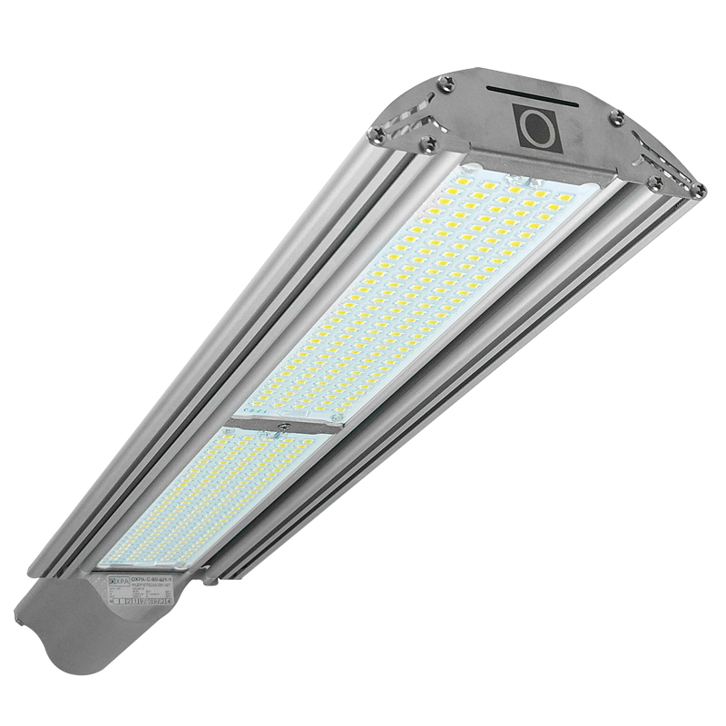 Светильники «ОХРА-С» НЦВР.676259.001 - светодиодные уличные светильники для эксплуатации в составе систем охранного освещения периметра. Светильники обеспечивают два режима освещения — Дежурный (30%) и Тревожный (100%) мощности; управление режимами освещения осуществляется замыканием / размыканием пары проводников отдельной линии управления (сухой контакт). Модельный ряд светильников включает в себя изделия мощностью 40,60 и 80 Вт с различными типами КСС.